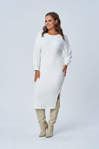 Эффектное двубортное платье длиной миди полуприлегающего силуэта. Линия плеча приспущена, рукав втачной три четверти. Горловина обработана обтачкой с  V-образным вырезом. Линия талии акцентирована притачным поясом. Имеются карманы в боковых швах. Изделие застёгивается на пуговицы. Без подкладки.