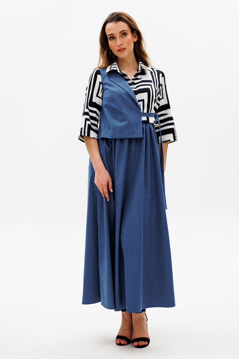 Эффектное комбинированное платье, состоящее из лифа со вставкой-имитацией жилета пиджачного типа по правой части переда. Лиф прямого кроя с втачным рукавом три четверти. Горловина обработана рубашечным воротником с отрезной стойкой. По линии талии собрано на резинку. Застёжка центральная на кнопки. Юбка А-силуэта