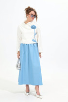 Платье макси комбинированное, двухцветное. Лиф ассиметричный по низу, с имитацией запаха, выполнен из костюмной ткани. Вырез горловины полукруглый, по спинке затежка на молнию. Рукава втачные, с манжетами и патами. Юбка на резинке, драпирующаяся, расширенного силуэта.