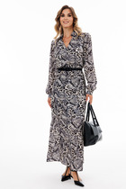 Платье состоит из двух платьев: нижнего и верхнего. Верхнее платье макси прямого свободного силуэта с воланом по низу изделия. Рукав втачной с притачным манжетом. Горловина обработана плосколежащим воротником из отделочной ткани фигурной формы. Центральная застёжка на петли и пуговицы. Нижнее платье комбинация на регулируемых бретелях.