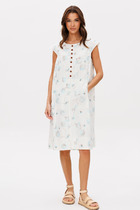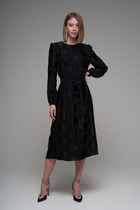 Платье состоит из двух платьев: нижнего и верхнего. Верхнее платье макси прямого свободного силуэта с воланом по низу изделия. Рукав втачной. Горловина обработана плосколежащим воротником. Центральная застёжка на петли и пуговицы. Нижнее платье комбинация на регулируемых бретелях.