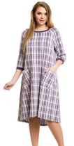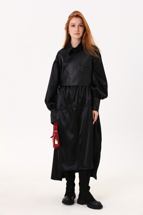 Платье прямого свободного кроя длиной миди, отрезное выше линии талии с двумя настрочными фигурными кулисами по переду и спинке. В кулисы вставлена шляпная резинка с фиксаторами по бокам. Воротник стояче-отложной рубашечного типа. Центральная застёжка на петли и пуговицы. Рукав втачной со сборкой по окату. Фигурная линия низа. В комплект входит деталь, имитирующая жилет. Фиксируется на декоративную тесьму и полукольца. Фурнитура может отличаться от фото.