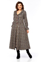 Платье комбинированное из двух тканей. Нижняя часть платья прямого силуэта, длинная , со сборкой по линии талии из отделочной ткани. Юбка на подкладке. Верхняя часть платья из основной ткани, частично на подкладке. Прямой силуэт, воротник пиджачного типа, рукав одношовный, втачной , с незначительно спущенной линией плеча, длинный, с притачной манжетой, декорированной разрезом. По линии ткани настрочная кулиса с завязками из основной ткани. Застежка центрально-бортовая на одну петлю и пуговицу функциональную и две пуговицы- имитация. Линия низа верхней части фигурная ассиметричная.