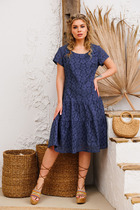 Платье прямого силуэта, состоящее из комбинации двух тканей - основной и отделочной. Воротник цельнокроеный хомут. Рукав одношовный, втачной, длинный. Нижняя юбка из отделочной ткани, со сборкой по линии талии. В виде отделки по левой части переда декоративный элемент  из отделочной ткани.