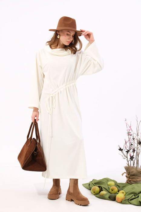 Элегантное платье свободного прямого силуэта длиной миди. Рукав реглан. Воротник-стойка. По переду фигурная настрочная кулиса. В боковых швах расположены карманы.