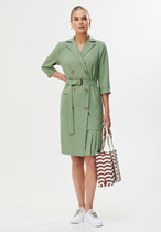 Платье макси с центральной отрезной застёжкой на потайную планку на петли и пуговицы.По переду и спинке цельнокроеные складки на уровне талии. Рукав втачной,одношовный рубашечноно типа. По низу рукава пробиты петли и вставлена завязка для фиксации сборки . Воротник рубашечный стояче отложной. В комплект к изделию идёт пояс из основной ткани для максимально комфортного регулирования объёма.