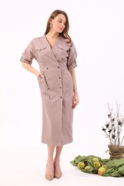 Платье макси с центральной отрезной застёжкой на центральную застежку на петли и пуговицы.По переду и спинке цельнокроеные складки на уровне талии. Рукав втачной,одношовный рубашечного типа. По низу рукава пробиты петли и вставлена завязка для фиксации сборки . Воротник рубашечный стояче отложной. В комплект идёт пояс из основной ткани.