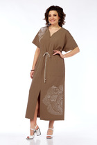 Платье длиной миди комбинированное, свободного кроя, расклешенное к низу. Перед состоит из центральной и боковой части. Спинка с притачной кокеткой, центральной и боковыми частями. На переде и спинке по линии талии настрочена кулиска, с регулировкой прилегания с помощью шнура. Рукав втачно одношовный короткий. Горловина изделия круглой формы.