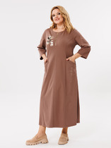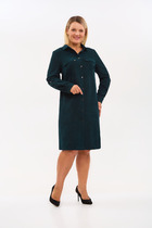 Платье длиной миди полуприлегающего силуэта.Застежка по переду бортовая, смещена в сторону левого бока, на  петли и пуговицы. Перед с рельефами из проймы, с нагрудной вытачкой и карманом. Нагрудная вытачка из рельефного шва. Спинка с плечевой вытачкой из плечевого шва и рельефами из проймы. В среднем шве спинки шлица. Рукав втачной, двухшовный. Вырез горловины переда имеет квадратную форму.