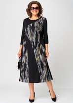 Платье женское, приталенного силуэта, выполнено из сетки-гофре с нитью «люрекс». Модель на трикотажной подкладке, без застежки и плечевых накладок. Платье отрезное по линии талии, с полуприлегающим лифом и расширенной к низу юбкой; для лучшего прилегания в области талии на внутренний шов настрочена узкая эластичная лента. Перед дополнен задрапированным поясом с перекрутом, концы которого входят в боковые швы. По плечевым швам, горловине и подрезу талии – сборка. Горловина округлая, окантована узкой косой бейкой из основного материала. Рукав короткий, расширенный, с фигурным низом, переходящим в разрез, края которого по окату скреплены на запах. Длина платья (от горловины спинки) – 131 см, длина платья (от талии спинки) – 92 см; длина рукава – 30 см.