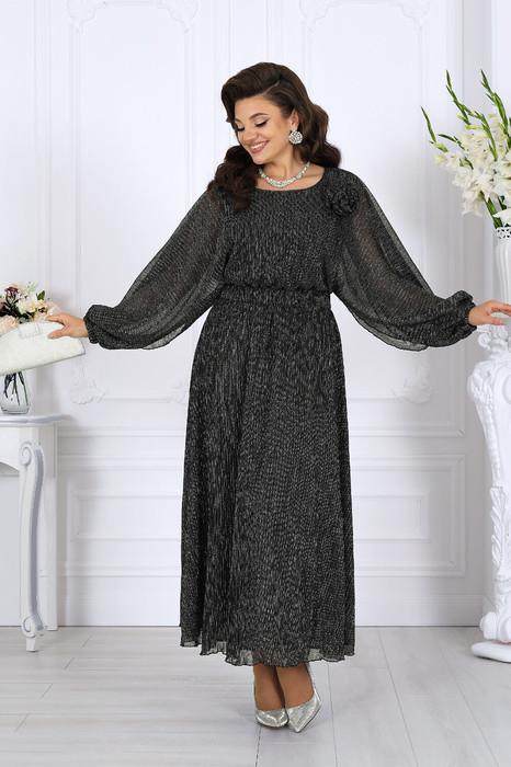 Платье женское, приталенного силуэта, выполнено из сетки-гофре с нитью «люрекс». Модель на трикотажной подкладке, без застежки и плечевых накладок. Платье отрезное по линии талии, со свободным лифом и расширенной к низу юбкой. Для лучшего прилегания в области талии в отрезном поясе предусмотрена эластичная лента, вставленная по всей длине. Лиф цельнокроеный с рукавами, без боковых швов -- с разрезами от талии до манжет. Для регулирования длины рукава внутрь манжеты протянута эластичная лента. Горловина округлая, окантована узкой косой бейкой из основного материала. Платье дополнено съемным «цветком» з основного полотна.