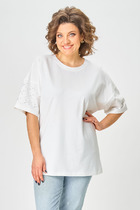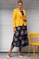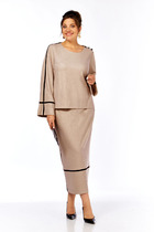 Платье женское полуприлегающего силуэта, выполнено из трикотажного полотна с фактурной лицевой стороной «люрекс». Модель на трикотажной подкладке, с плечевыми накладками. На правой части переда, вдоль отрезного пояса, заложены косые односторонние складки; детали лифа и юбки скреплены на запах. Низ платья асимметричный: правая часть переда удлинена к центру и оформлена углом, левая -- скругленная и входит в правый боковой шов. На спинке обработаны талиевые вытачки. В левом боковом шве предусмотрена застежка на потайную тесьму-«молнию» (35 см). Рукав длиной 3/4, втачной. Платье дополнено съемным «цветком» из основного полотна. Длина платья-108 см; длина рукава-41 см.