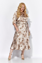 Платье женское полуприлегающего силуэта, выполнено из трикотажного полотна с фактурной лицевой стороной «люрекс». Модель на трикотажной подкладке, с плечевыми накладками. На правой части переда, вдоль отрезного пояса, заложены косые односторонние складки; детали лифа и юбки скреплены на запах. Низ платья асимметричный: правая часть переда удлинена к центру и оформлена углом, левая -- скругленная и входит в правый боковой шов. На спинке обработаны талиевые вытачки.  В левом боковом шве предусмотрена застежка на потайную тесьму-«молнию» (35 см). Рукав длиной 3/4, втачной. Платье дополнено съемным «цветком» из основного полотна. Длина платья-108 см; длина рукава-41 см.