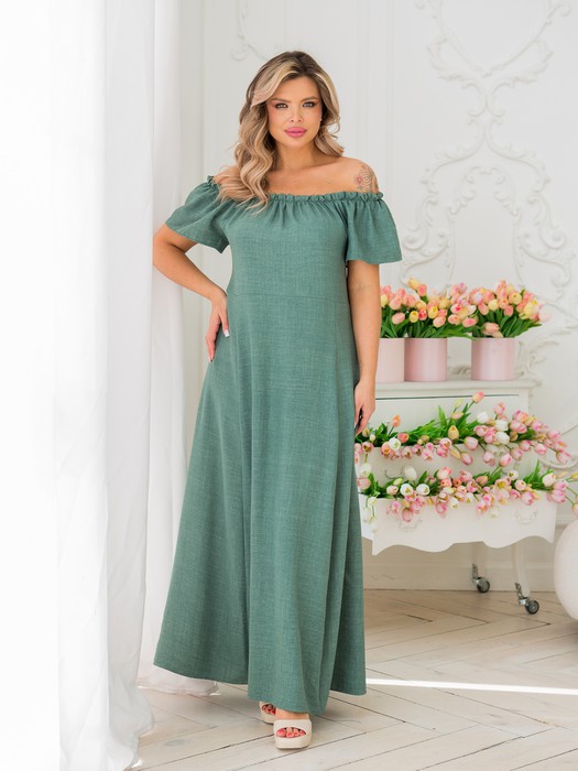 Повседневное платья в стиле Кантри длиной макси, выполнено из тонкой плательной ткани с эффектом крэш. Платье отрезное по линии талии. Верх переда платья целый. Спинка с отрезными бочками. В швах притачивания бочков воздушные петли со шнуровкой, позволяющей регулировать свободу прилегания по фигуре. Рукав-реглан короткий. Длина рукава от горловины в 50 р-ре – 19 см. в 62 р-ре – 22 см., ширина рукава по низу в 50 р-ре – 51 см. в 62 р-ре – 60 см. Горловина со сборкой на резину позволяет носить платье с открытыми плечами. Юбка 4-х клинка слегка расклешенная к низу. Платье без застежек и подклада. Длина изделия по спинке в 50 р-ре – 128 см. в 64 р-ре – 135 см.
