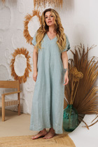 Элегантное платье прямого силуэта, выполнено из эластичной креповой ткани. Перед целый с двумя нагрудными вытачками. Платье с удобными карманами в боковых швах. Спинка с двумя с вертикальными вытачками, средним швом и шлицей длиной 25 см. Платье с оригинальным втачным воротником-галстуком и V-образным вырезом по переду. Горловина переда и спинки обработана обтачкой. Рукав втачной, зауженный с притачным воланом по низу. Длина рукава от плечевой точки в 46 р-ре – 61 см., в 56 р-ре – 63 см., обхват рукава по низу (по шву притачивания волана) в 46 р-ре – 22 см. в 56 р-ре – 28 см. Платье без подкалада и застежек. Длина по спинке в 46 р-ре – 102 см. в 56 р-ре – 104 см.