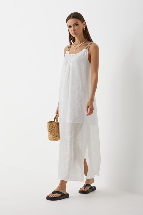 Платье свободного покроя, на бретелях, выполненных из декоративного шнура. Передняя и задняя половинки с небольшими сборками. Боковые швы с разрезами.