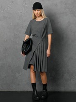 Нарядное платье из струящейся ткани, отрезное по линии талии. Верх летучая мышь, по низу рукава сборка и притачная манжета. Вырез горловины округлой формы. По переду ассиметричная деталь от плеча до линии подреза. По линии подреза резинка. Нижняя часть платья клеш. К платью прилагается интересный  пояс, украшенный стразами.