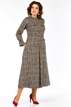 Платье женское, полуприлегающего силуэта, втачного покроя. Выполнено из трикотажного плательного полотна с блеском. Горловина округлой формы, задекорированная отделочной тесьмой по форме горловины переда. Спинка с талиевыми вытачками и средним швом, в котором расположена тесьма-молния. Рукава 7/8 с разрезом по шву до локтя. По переду расположены нагрудные вытачки и подрез закругленной формы, переходящий в разрез. Платье по фигуре и книзу заужено.