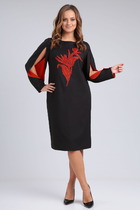 Платье женское со спущенным плечом, с центрально-бортовой застежкой на петли-пуговицы. Платье отрезное по талии, с имитацией пояса, фиксирующегося на петлю и пуговицу, по спинке с резинкой. Платье расширено к низу от линии талии. Горловина оформлена воротником пиджачного типа. Рукава до локтя с цельнокроеной манжетой.