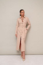 По переду центральный шов, сверху переходящий в вырез, а так же бочок из проймы, с нагрудной вытачкой, с карманами в шве в нижней части платья. Над карманом пришит клапан с декоративной пуговицей. Воротник стояче-отложной. Спинка со средним швом, снизу заканчивающимся разрезом. Рукав рубашечного покроя, одношовный, длиной 7/8, к низу притачивается манжета – на половину собранная на резинку. К платью прилагается съемный пояс с отделочной пряжкой.