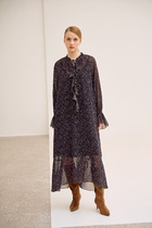 Модель состоит из двух видов, нижнего и верхнего. Нижнее платье полуприлегающего силуэта на лямках. Верхнее из легкого шифона с принтом "горох". Модель отрезная по талии. Юбка состоит из трех ярусов на сборке. Округлая горловина отделана узкой бейкой переходящей в завязки, по переду разрез - капелька. Рукав втачной длинный, низ на резинке. Низ ровный, без разрезов. Легкое и воздушное платье подойдет для прогулок и приятных встреч.