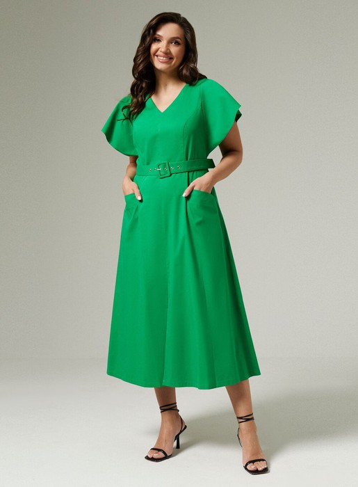 Платье приталенного силуэта с поясом, рельефами по переду и V-образной горловиной. Также на передней части платья два кармана с клапанами, средний шов, заканчивающийся встречной складкой. Спинка со средним швом, в котором находится молния, и двумя талиевыми вытачками. Рукав-объёмная рюша, входящая в пройму.
