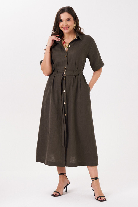 Платье женское из льняной ткани для повседневной носки. Платье полуприлегающего силуэта. Застежка в платье центральная бортовая на обметанные петли и пуговицы. Платье имеет отрезную кокетку, переходящую на рукав и четыре защипа, а также имеются шлевки за счет чего платье можно носить под пояс. Спинка со средним швом. Горловина обработана рубашечным воротником с отрезной стойкой. Рукава втачные длиной на уровне локтя. Платье длиной миди. Стильное платье модного коричневого оттенка обязательно будет притягивать восхищенные взгляды прохожих. Платье отлично будет подчеркивать изящество вашей фигуры и скрывать имеющиеся недостатки.