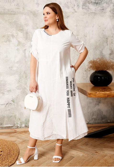 Стильное молодежное платье из хлопка с легким эффектом крэш. Платье полуприлегающего силуэта, длиной миди, с ассиметричными декоративными подрезами по переду, с круглым вырезом горловины. Платье на хлопковой подкладки. На рукавах имеются декоративные паты с печатью. По бокам карманы. Платье дополнено шрифтовыми рисунками по переду. Модное молодежное платье отличный вариант для повседневных дней.