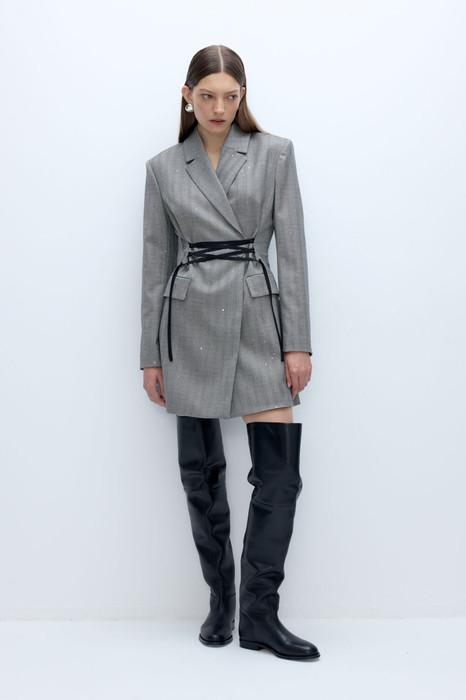 Детали: полуприлегающий силуэт, рельефы, пиджачный воротник, застежка на две петли и пуговицы, функциональные карманы, платье на подкладке 100% хлопок. Платье можно зашнуровать двумя способами- по бокам и по центру.
