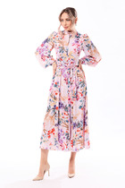 Детали: прилегающий силуэт, асимметричный крой, фигурный вырез горловины переда и спинки, втачные удлиненные рукава, потайная застежка по спинке.