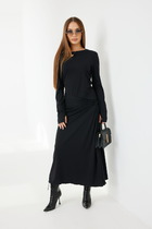 Детали: платье полуприлегающего силуэта, отрезное по талии с напуском, нижняя часть переда с ассиметричными складками, нижняя часть спинки с талиевыми вытачками, верхняя часть платья со складками на талии, рубашечный воротник, застёжка на потайную планку с пуговицами, потайная молния в боковом шве, рубашечный покрой рукава с расширенным плечом, широкие манжеты. Юбка платья на подкладке