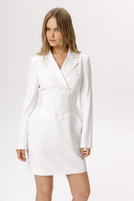 Детали: прилегающий силуэт, платье отрезное по линии талии, рельефы по переду лифа, талиевые вытачки на спинке лифа, складки по переду и боковым швам юбки, корсетный пояс с рельефными швами и регилином, втачной двухшовный рукав, пиджачный воротник, потайная застёжка на молнию в среднем шве спинки, шнуровка по спинке. Платье на подкладке.