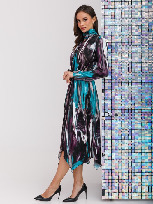 Модель полуприлегающего силуэта, с отрезной линией талии, с плечевыми накладками. По талии защипы и сборка на резину. В среднем шве переда V-образный вырез. В среднем шве спинки обработана потайная застёжка молния. По горловине сборка. Воротник стойка. По низу рукава разрез и застёжка на обтяжные пуговицы и воздушные петли.