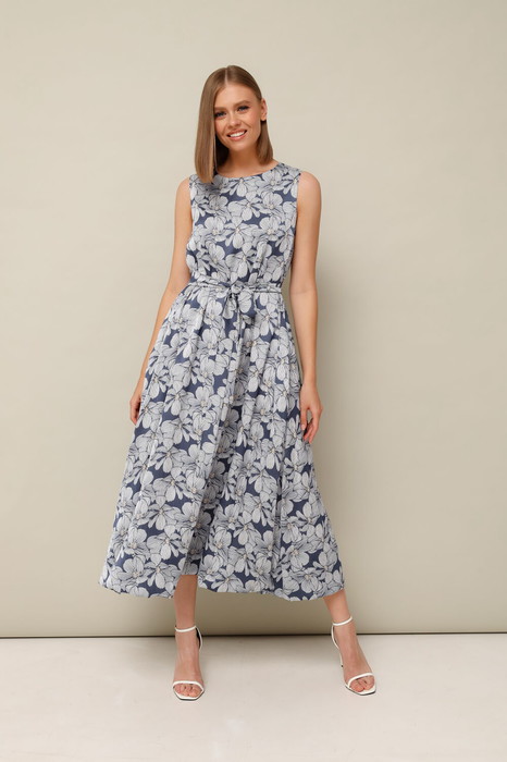 Эффектное платье-баллон, разведенное к низу в длине миди. Округлый вырез горловины. По спинке разрез с застежкой на пуговицу и навесную петлю. В боковых швах карманы. Платье на х/б подкладке. Пояс съемный из основной ткани.