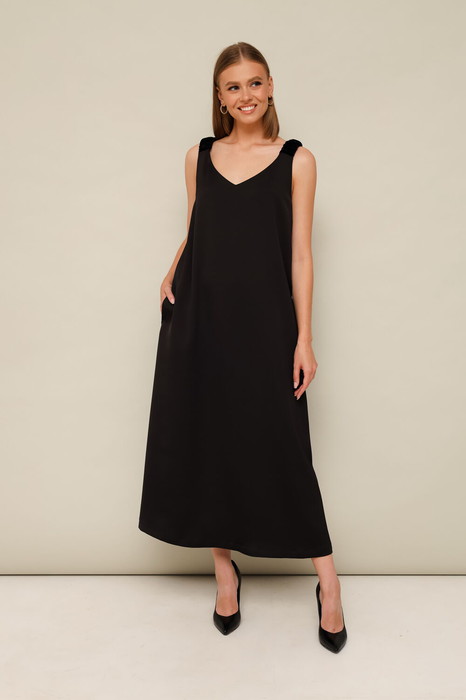 Лаконичное платье в длине миди, выполнено из струящейся ткани с благородным матовым блеском. V-образный вырез горловины переда и спинки. Бретели на резинке со сборкой из отделочной бархатной ткани. В боковых швах обработаны карманы. Спинка со средним швом. Изделие без подкладки.