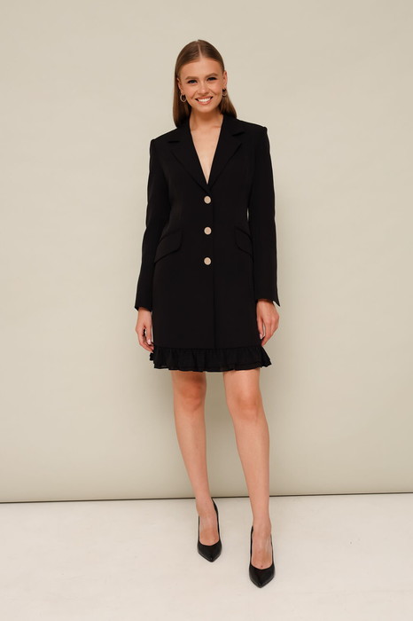 Стильное платье полуприлегающего силуэта, выполнено из костюмно-плательной ткани. Застёжка центральная на петли и пуговицы, внутри платье фиксируется на потайную пуговицу. Воротник пиджачного типа с отложными лацканами. Перед платья с рельефами и наклонными карманами с клапанами в рамку. Рукава втачные с высокими шлицами по низу. Низ платья с оборкой в 2 ряда из отделочной ткани. Спинка с рельефами и средним швом. Изделие на подкладке.