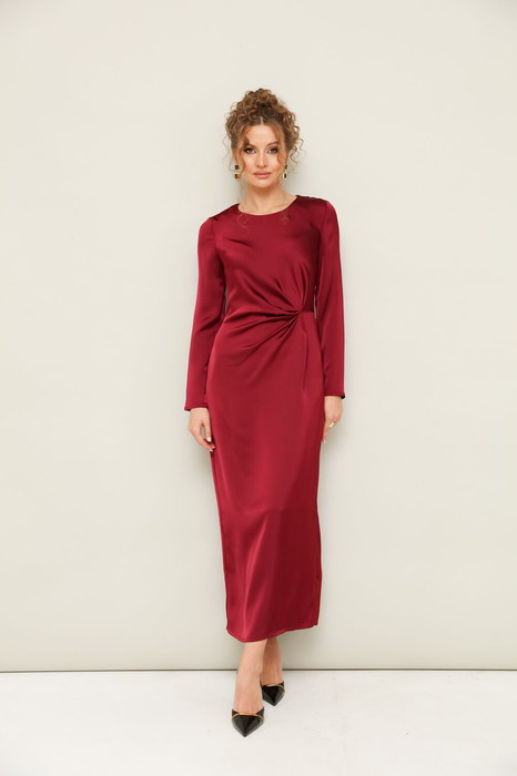 Вечернее платье полуприлегающего силуэта, выполнено из струящейся ткани с благородным матовым блеском. Горловина округлой формы. В области талии заложены складки, плавно переходящие в драпировку. Рукава втачные длинные. Застежка в среднем шве спинки на тесьму молнию. Для удобства движения сзади обработан разрез.