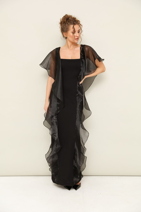 Платье выполнено из трикотажного полотна и органзы. Горловина с вырезом «каре». Перед и спинка с рельефами, которые декорированы воланами из органзы. Застёжка на потайную молнию в среднем шве спинки, переходящая в шлицу.