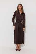 Платье свободного кроя, длиной до середины бедра. На левом переде настрочен накладной карман. Воротник пиджачного типа. Застежка по переду потайная на петли и пуговицы. Рукава одношовные, втачные, длинные. По низу рукава обработан разрез, односторонние складки и притачная манжета, которая застегивается на навесные петли и пуговицы. Платье дополняет съемный пояс с пряжкой.