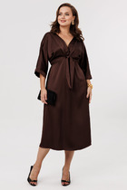 Платье полуприлегающего силуэта, выполненное на запах, длиной до середины бедра. Платье отрезное по линии талии. Лиф спинки со средним швом и рельефами. Лиф переда с рельефами от пройм до подреза по талии. Юбка спинки со средним швом и талиевыми вытачками. Юбка переда ассиметричная: правый перед укорочен, левый перед удлинен. Воротник пиджачного типа. Рукава двушовные, втачные, длинные. Застежка по переду на петли и пуговицы. Платье на подкладке с плечевыми накладками.