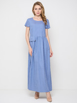 Платье женское относится к нарядной торжественной одежде. Платье полуприлегающего силуэта, слегка расширено к низу, длиной за колено. Перед с отрезной кокеткой и двумя нагрудными вытачками. Спинка с отрезной кокеткой и двумя талиевыми вытачками. Горловина с V-образным фигурным вырезом. Рукав втачной короткий, одно шовный. Платье на подкладке. Застежка на потайную тесьму-молнию в левом боковом шве платья. Длина платья от плеча 107 см. Длина рукава 26 см