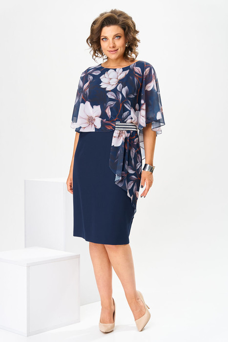 Платье женское относится к нарядной торжественной одежде. Платье полуприлегающего силуэта, с отлетной накидкой длиной за колено. Перед с двумя нагрудными вытачками, с двумя талиевыми вытачками. Спинка с двумя талиевыми вытачками и средним швом, заканчивающимся шлицей. Застежка на потайную тесьму-молнию в среднем шве спинки. Горловина круглая, обтачная, без воротника, по горловине закреплена накидка. Слева на уровне линии талии отделочным хлястиком, декорированным тесьмой накидка закрепляется на платье, нижняя часть накидки закреплена в левом боковом шве. Накидка с фигурным низом. Платье без рукавов. Длина спинки 103 см. Длина накидки от горловины 38 см
