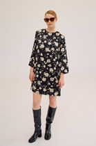 Платье женское отрезной по линии талии, расширенное к низу, длиной до нижней части икры. Верхняя часть переда с двумя отрезными кокетками, с двумя притачными планками, с легкой сборкой по шву притачивания кокеток, нижняя часть с горизонтальным подрезом, верхний срез нижней части которого с легкой сборкой. Верхняя часть спинки цельнокроенная, нижняя часть- с горизонтальны подрезом, верхний срез нижней части которого с легкой сборкой. Горловина круглая, с втачной стойкой. Застежка центральная на 5 вертикальных обметанных петель и пять пришивных пуговиц. По линии талии платье собрано на эластичную тесьму. Рукав втачной, одно шовный, длиной за локоть с притачной отложной манжетой. Платье с плечевыми накладками. Длина спинки 127 см. Длина рукава 37 см