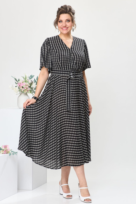 Платье женское, относится к торжественной одежде. Платье женское, отрезное по линии талии, расширенное к низу. Верхняя часть переда с 2-мя отрезными бочками, нижняя без конструктивных особенностей. Верхняя часть спинки со средним швом и 2-мя таллиевыми вытачками, нижняя без конструктивных особенностей. Горловина с V-образным вырезом, с запахом, обтачная без воротника. Застёжка на потайную тесьму-молнию в левом боковом шве платья. Рукав втачной, одно шовный, расширенный к низу, 2-мя односторонними складками по окату, рукав короткий. Платье с плечевыми накладками. К платью прилагается съёмный пояс с застёжкой на пряжку и пробивные блочки.
