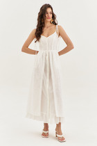Платье женское отрезное по линии талии, расширенное к низу, длиной до середины икры. Верхняя часть переда с 2-мя нагрудными вытачками, нижняя цельнокроеная. Верхняя часть спинки с 2-мя таллиевыми вытачками, с обтачным разрезом по центру, фиксирующимся по горловине на 1-ну навесную петлю и 1-ну пришивную пуговицу; нижняя часть с 2-мя таллиевыми вытачками. Горловина круглая обточная, без воротника. Застёжка на потайную тесьму-молнию в левом боковом шве платья. Рукав втачной, одно шовный, по окату с лёгкой сборкой, длиной 7/8, низ собран на эластичную тесьму. Платье на подкладке. Платье без плечевых накладок. К платью прилагается отдельный ремень. Длина спинки платья 120 см, длина рукава 56 см.