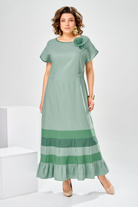 Платье женское, предназначено для повседневной носки. , так же может использоваться как нарядная одежда. Платье женское, длинное, слегка расширенное к низу. Перед с 2-мя отрезными бочками от подреза на уровне линии талии. Спинка отрезная по линии талии. Шов соединения деталей платья платья по линии талии с надстрочной кулисой собранной на эластичную тесьму. Низ платья с 4-мя горизонтальными притачными планками, чередующимися по цвету, на 3-х планках по 4-и односторонних маленьких складки по переду и спинки, формирующими расширение к низу. Низ платья с притачным воланам, с лёгкой сборкой по верхнему срезу. Горловина круглая, без воротника. Рукав цельнокроеный, короткий. Горловина и низ рукава обработаны косой бейкой. Платье со съёмным украшением. Платье без плечевых накладок. Длина спинки платья 138 см, ширина рукава под проймой 23 см.