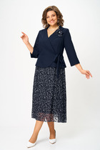 Комплект женский предназначен для повседневной носки. Комплект женский 2-х предметный. Платье и нижнее платье. Платье женское отрезное по линии талии, расширенное к низу, длиной до нижней части икры. Верхняя часть переда с 2-мя талиевыми вытачками, с 2-мя приточными вертикальными планками декорированными надстрочным кружевом. Верхняя часть спинки цельнокроеная. Верхний срез нижней части платья с лёгкой сборкой, шов соединения верхней и нижней частей платья по линии талии собран на эластичную тесьму. Низ платья с притачным воланом с лёгкой сборкой по верхнему срезу, декорирован надстрочным кружевом. Горловина круглая с втачной стойкой. Застёжка центральная на 5-ть вертикально обмётанных петель и 2-пришивных пуговиц. Рукав втачной, одно шовный, длинный, низ рукава собран на эластичную тесьму. Платье без плечевых накладок. Нижнее платье полу прилегающего силуэта. Перед с 2-мя нагрудными вытачками, спинка с 2-мя талиевыми вытачками. Горловина фигурная, без воротника. Верхний срез спинки собран на эластичную тесьму. Горловина, проймы, бретели обмётаны косой бейкой. Бретели на регулируемых бельевых пряжках. Длина спинки верхнего платья 130 см, длина рукава 58 см.
