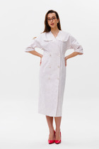 Двубортное платье из костюмной ткани на подкладке. По переду платья - нагрудные вытачки, по спинке - рельефы. Бочки, смещенные к переду, делают удобным расположение карманов в швах. Воротник - отложными лацканами пиджачного типа. Рукава - двухшовные, длинные, со шлицей и 2 пуговицами. Жакет застегивается на 2 основные пуговицы, 1 потайную. Платье украшает цветок ручной работы.
