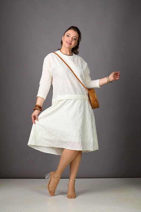 Ах, какая находка - платье  из шикарного жатого хлопка с вышивкой! Легкое, невероятно красивое, комфортное платье  станет вашим пропуском в лето! Верхняя часть платья «летучая мышь» подойдет любому типу фигуры, расклешенная нижняя  добавит легкости. Изюминка платья-разница в длине между передом и спинкой. Рукава трехчетвертные. По спинке - средний шов, молния. Cкрасьте момент с Rosheli!