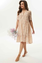 Верхнее платье А-силуэта из шифона с втачным рукавом, с карманами в боковых швах. По горловине отложной воротник и планка с декоративными пуговицами. Спинка со средним швом. Рукав с притачной манжетой, фиксируется патой. Низ платья фигурный.